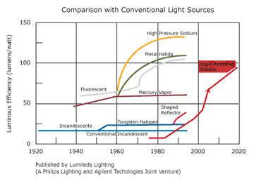 LEDs의 빛난 효험은 (루멘 또는 와트) 색깔로 변화한다. 지금 백색 LEDs는 20 - 60 lm/W. 사이에서 측정하고 있다. 이 차이는 와트수 뿐만 아니라 색도에 있는 다름에 지배를 받는다. 미국 에너지성은 최근에 2010년까지 100 lms/W이기 위하여 효험을 견적하는 학문을 풀어 놓았다. 1개의 견적에 의하여, LED 신호로 혼자 미국에 있는 백열 교통 신호를 교환하는 것은 거의 2.5 10억 kWh를 매년 저장할 것입니다. 빨간 신호등은, 예를 들면, 에너지 절약을 통해 2.5 3 년에 있는 그들의 처음 투자를 후에 지불한다. 감소된 정비 때문에 저축은 보충이 어렵거나 비싸 때 뜻깊, 경비 절약에 있는 지도자일 수 있다.