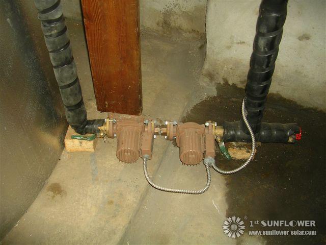 絶縁されたふたおよび完全な配管が付いているタンクはここについている。 1 1/2 " x 120 'の銅のコイルはタンクの中で中断される。 私はコイル内のタンク効果のビットのために特大直径のコイルを使用した-熱湯の10ガロンを握る。 借用者が熱湯のコックを開けるとき、通りからの加圧冷水はヒーターに方法のこのsubmersedコイルを貫流し、方法で暖まる。 ヒーターに入る水は部分的または完全にヒーターに達する、ヒーターは大いにより少なくに来るまでに熱され。 繰り返しの仕事で、よりもむしろ1つの大口径のコイルを、私同様にうまく働き、より少しを要するかもしれない複数のより小さいコイルを並行して使用するかもしれない使用しなさい。 上部の黒いラインはソーラーコレクタからのリターンである。 床の2つのポンプに動く黒いラインはコレクターまでタンクの底から行く銅のサクションラインである。 ポンプキャビテーションと呼ばれる事がある。 私が理解するようにポンプ内の吸引の下のそれは、騒音を作り、ポンプ生命を短くするポンプの中で、水(特に熱湯) (本質的に沸騰)蒸発できる。 ポンプの入口の側面の十分な圧力をキャビテーションをポンプの出口の側面の制限の流れができるように除去できる持っていることは。 ポンプに吸入圧を最大にするためには、私はそれらを可能ように地面に同様に低い保った。 キャビテーションは問題ではなかった。