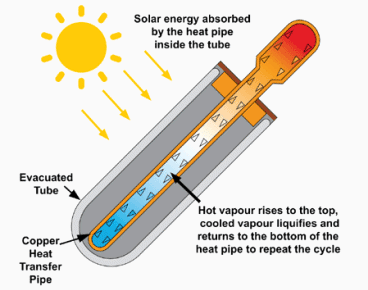 대부분의 (그렇지 않으면 모두) 진공 튜브 수집가들을 통해 직접 액체를 전달하는 대신 자신의 코어에 대한 히트 파이프를 사용합니다. 대피 열 파이프 튜브는 (EHPTs) 여러 대피 유리 튜브로 구성되어 있습니다 융합 흡수기 플레이트를 포함하는 각
