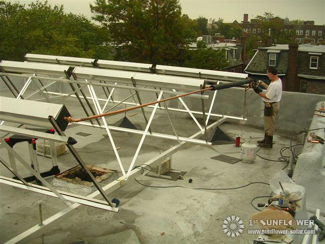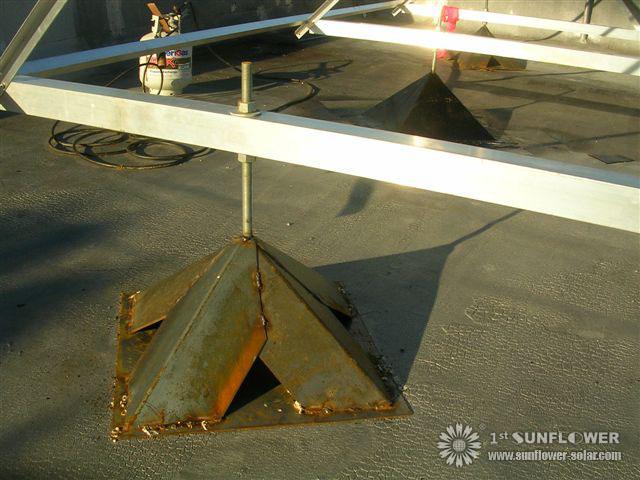 과정에 있는 기구는 여기 있다. 강철 피라미드 기초는 1/8의 " 강철 플레이트이다. 몇몇은 자르고 굴곡은 Fazzio이라고 (남쪽 저어지에 있는 훌륭한 금속 야드) 행해졌다. 나는 각 커트 및 용접을 했다. 그들은 목제 지붕 장선으로 아래로 조여지고 그(것)들에게 거의 영 정비를 하기 위하여 아래로 지붕을 다는 토치로 그 후에 넘어서 지붕을 달았다. 구조의 나머지는 스테인리스 놀이쇠를 가진 모든 알루미늄이다. 전체 구조의 수평면은 경미한 대각선 피치에 탱크 등을 맞댄 수집가가 거치될 때, 모두 기울 것이다 이렇게 놓인다. 지붕이 망치 또는 모든 1개의 피치인 경우에, 여기에서 올려진 기구는 쉬운 지붕 정비를 허용한다 그러나, 지붕에 구조를 바르게 거치하는 것이 쉬워고 더 쌌ㄹ 지도 모르고 또한 좋은 drainback 피치를 창조한다. 주요 광속은 3x3x1/8 " x 24 ' 긴 알루미늄 정연한 관이다. 경도 크로스 멤버는 2x2x20'x1/8 알루미늄 정연한 관이었다. 대각선 보강은 1개의 1/2 x 1개의 1/2 x 1/8의 알루미늄 각이다. 구조는 나가 그것을 원한 방법에 관하여 나왔다. 쾌활하지 않음. overkilled. 직류 전기를 통한 강철은 너무 작동하고 더 싸게 이었었다, 그러나 알루미늄은 오래 지속되어야 하고에 일하기 쉽다